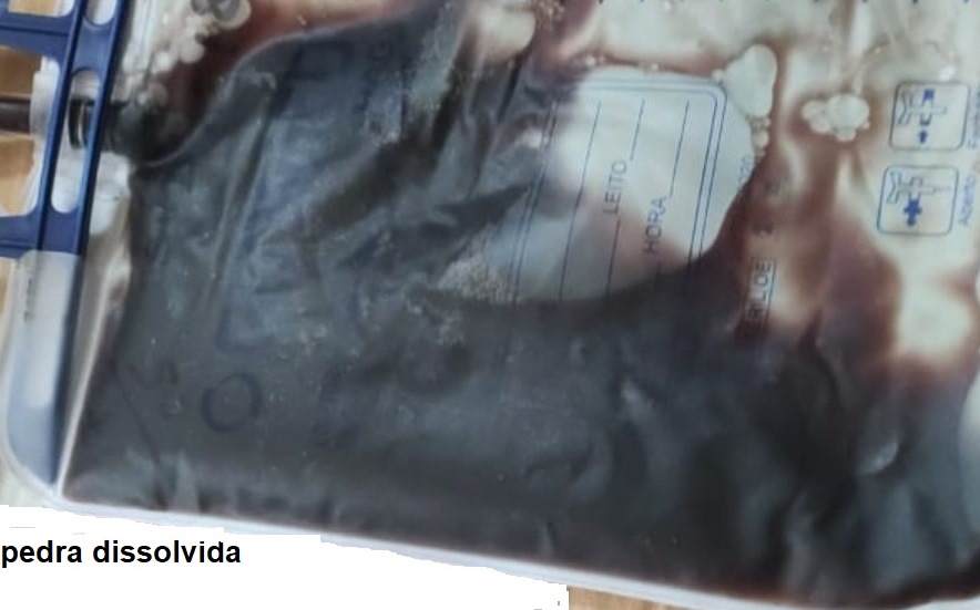 Bolsa coletora com pedra derretida. OBS: Esse paciente tinha várias pedras. A maior 26 milimetro