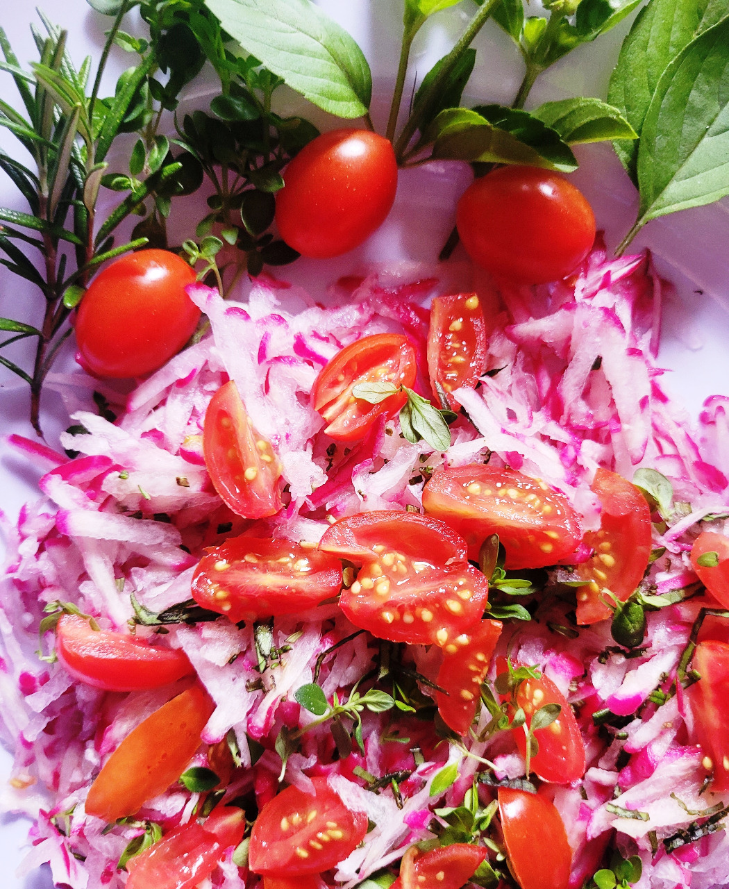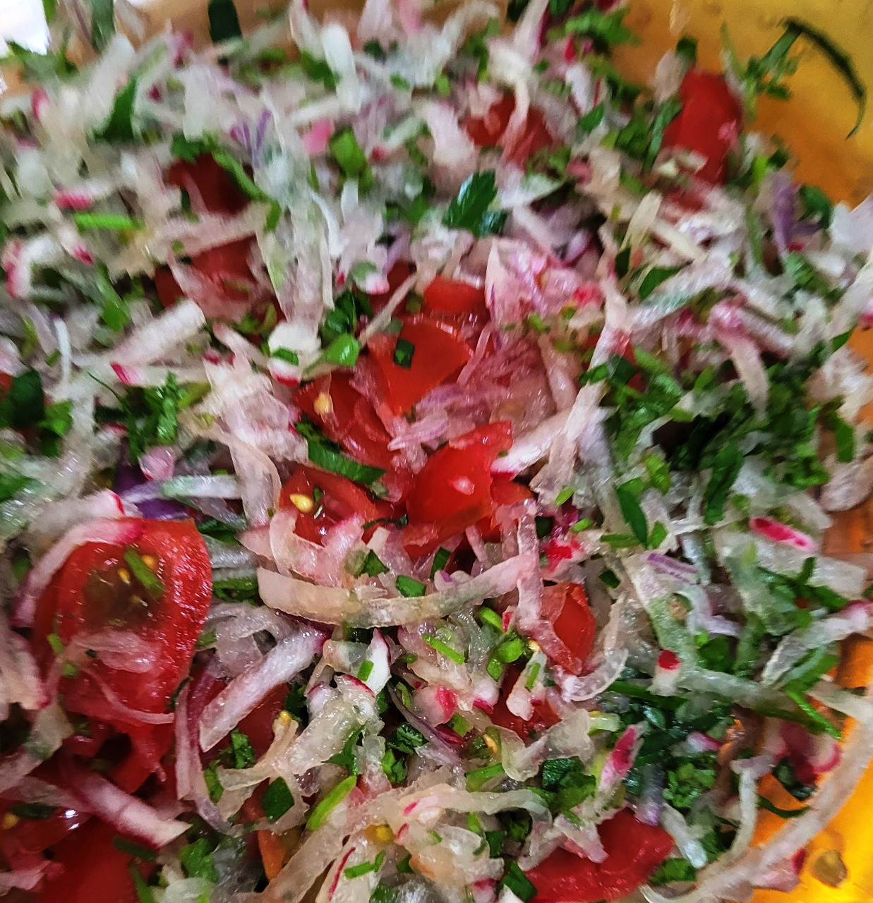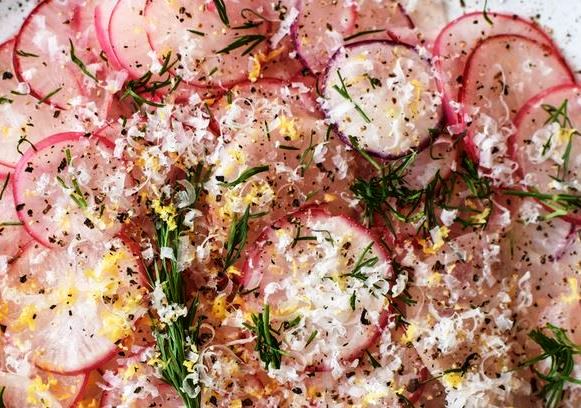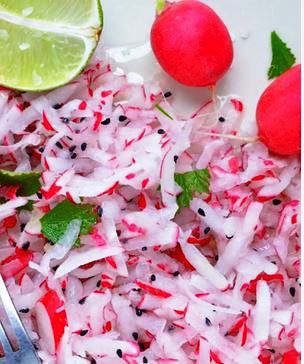 O Rabanete pode ser cortado em fatias finas ou ralado em tiras.